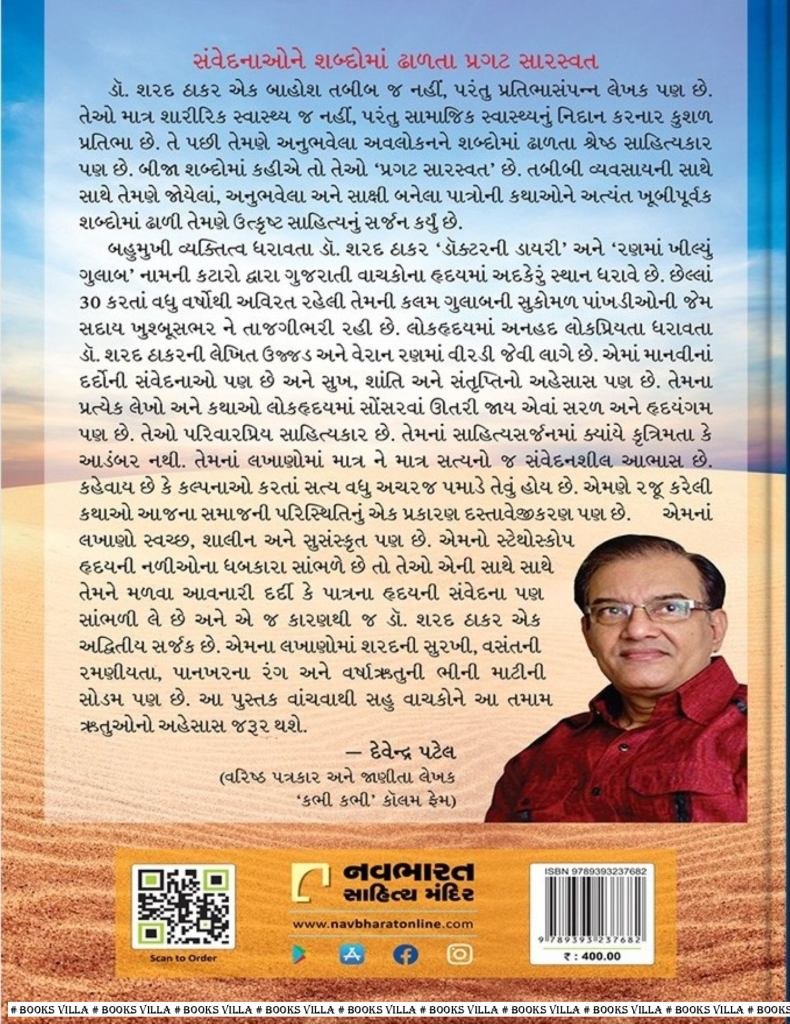 બહુમુખી વ્યક્તિત્વ ધરાવતા ડૉ. શરદ ઠાકર ‘ડૉક્ટ૨ની ડાયરી’ અને ‘રણમાં ખીલ્યું ગુલાબ’ નામની કટારો દ્વારા ગુજરાતી વાચકોના હૃદયમાં અદકેરું સ્થાન ધરાવે છે. છેલ્લાં 30 કરતાં વધુ વર્ષોથી અવિરત રહેલી તેમની કલમ ગુલાબની સુકોમળ પાંખડીઓની જેમ સદાય ખુબ્સભ૨ ને તાજગીભરી રહી છે. લોકહૃદયમાં અનહદ લોકપ્રિયતા ધરાવતા ડૉ. શરદ ઠાકરની લેખિત ઉજ્જડ અને વેરાન રણમાં વીરડી જેવી લાગે છે. એમાં માનવીનાં દર્દોની સંવેદનાઓ પણ છે અને સુખ, શાંતિ અને સંતૃપ્તિનો અહેસાસ પણ છે. તેમના પ્રત્યેક લેખો અને કથાઓ લોકહૃદયમાં સોંસ૨વાં ઊતરી જાય એવાં સરળ અને હૃદયંગમ પણ છે. તેઓ પરિવારપ્રિય સાહિત્યકાર છે. તેમનાં સાહિત્યસર્જનમાં ક્યાંયે કૃત્રિમતા કે આડંબર નથી. તેમનાં લખાણોમાં માત્ર ને માત્ર સત્યનો જ સંવેદનશીલ આભાસ છે. કહેવાય છે કે કલ્પનાઓ કરતાં સત્ય વધુ અચરજ પમાડે તેવું હોય છે. એમણે ૨જૂ કરેલી કથાઓ આજના સમાજની પરિસ્થિતિનું એક પ્રકા૨ણ દસ્તાવેજીકરણ પણ છે. લખાણો સ્વચ્છ, શાલીન અને સુસંસ્કૃત પણ છે. એમનો સ્ટેથોસ્કોપ હૃદયની નળીઓના ધબકારા સાંભળે છે તો તેઓ એની સાથે સાથે તેમને મળવા આવનારી દર્દી કે પાત્રના હૃદયની સંવેદના પણ સાંભળી લે છે અને એ જ કારણથી જ ડૉ. શરદ ઠાક૨ એક અદ્વિતીય સર્જક છે. એમના લખાણોમાં શ૨દની સુરખી, વસંતની રમણીયતા, પાનખરના રંગ અને વર્ષાઋતુની ભીની માટીની સોડમ પણ છે. આ પુસ્તક વાંચવાથી સહુ વાચકોને આ તમામ ઋતુઓનો અહેસાસ જરૂ૨ થશે.