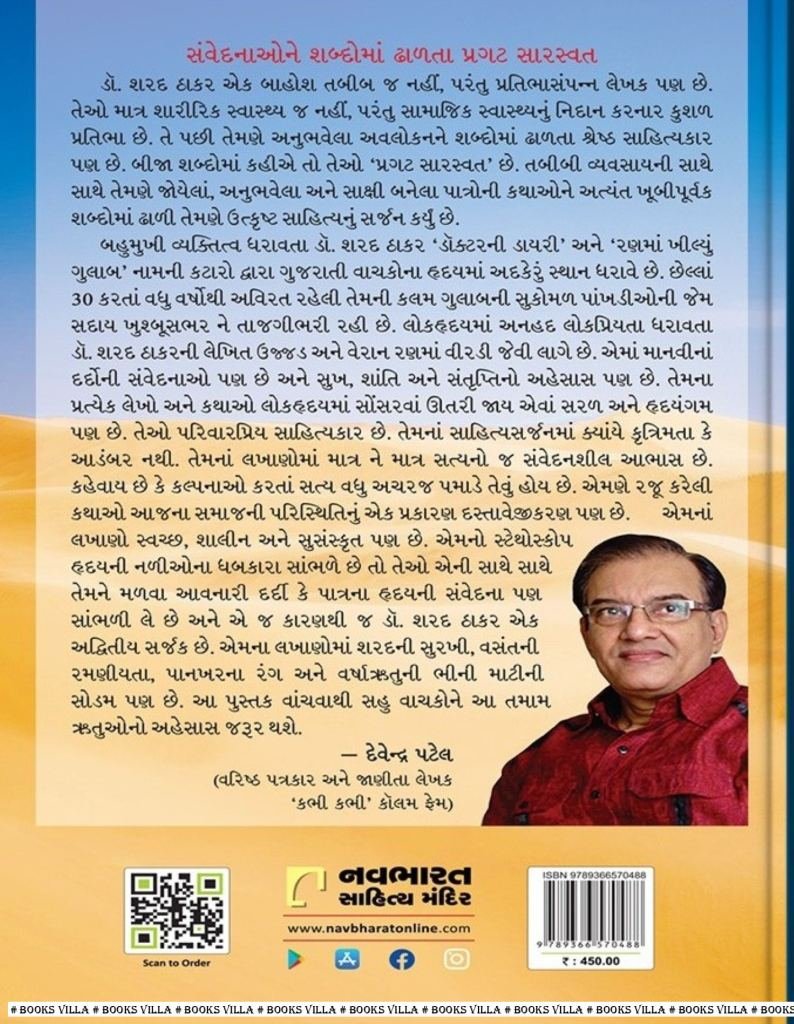 બહુમુખી વ્યક્તિત્વ ધરાવતા ડૉ. શરદ ઠાકર ‘ડૉક્ટ૨ની ડાયરી’ અને ‘રણમાં ખીલ્યું ગુલાબ’ નામની કટારો દ્વારા ગુજરાતી વાચકોના હૃદયમાં અદકેરું સ્થાન ધરાવે છે. છેલ્લાં 30 કરતાં વધુ વર્ષોથી અવિરત રહેલી તેમની કલમ ગુલાબની સુકોમળ પાંખડીઓની જેમ સદાય ખુબ્સભ૨ ને તાજગીભરી રહી છે. લોકહૃદયમાં અનહદ લોકપ્રિયતા ધરાવતા ડૉ. શરદ ઠાકરની લેખિત ઉજ્જડ અને વેરાન રણમાં વીરડી જેવી લાગે છે. એમાં માનવીનાં દર્દોની સંવેદનાઓ પણ છે અને સુખ, શાંતિ અને સંતૃપ્તિનો અહેસાસ પણ છે. તેમના પ્રત્યેક લેખો અને કથાઓ લોકહૃદયમાં સોંસ૨વાં ઊતરી જાય એવાં સરળ અને હૃદયંગમ પણ છે. તેઓ પરિવારપ્રિય સાહિત્યકાર છે. તેમનાં સાહિત્યસર્જનમાં ક્યાંયે કૃત્રિમતા કે આડંબર નથી. તેમનાં લખાણોમાં માત્ર ને માત્ર સત્યનો જ સંવેદનશીલ આભાસ છે. કહેવાય છે કે કલ્પનાઓ કરતાં સત્ય વધુ અચરજ પમાડે તેવું હોય છે. એમણે ૨જૂ કરેલી કથાઓ આજના સમાજની પરિસ્થિતિનું એક પ્રકા૨ણ દસ્તાવેજીકરણ પણ છે. લખાણો સ્વચ્છ, શાલીન અને સુસંસ્કૃત પણ છે. એમનો સ્ટેથોસ્કોપ હૃદયની નળીઓના ધબકારા સાંભળે છે તો તેઓ એની સાથે સાથે તેમને મળવા આવનારી દર્દી કે પાત્રના હૃદયની સંવેદના પણ સાંભળી લે છે અને એ જ કારણથી જ ડૉ. શરદ ઠાક૨ એક અદ્વિતીય સર્જક છે. એમના લખાણોમાં શ૨દની સુરખી, વસંતની રમણીયતા, પાનખરના રંગ અને વર્ષાઋતુની ભીની માટીની સોડમ પણ છે. આ પુસ્તક વાંચવાથી સહુ વાચકોને આ તમામ ઋતુઓનો અહેસાસ જરૂ૨ થશે.