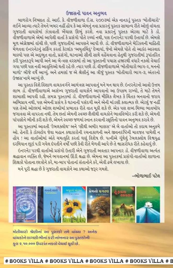 બાળરોગ નિષ્ણાત ડૉ. આઈ. કે. વીજળીવાળા ઈ.સ. ૨૦૦૩માં એક નાનકડું પુસ્તક ‘મોતીચારો' લઈને આવ્યા ત્યારે તેમને ખબર નહીં હોય કે આ એમનું નવા પ્રકારનું પુસ્તક સામાન્ય રીતે ઓછું વાંચતા ગુજરાતી વાચકોમાં ઝંઝાવાતી ખેંચાણ ઊભું કરશે. નવા પ્રકારનું પુસ્તક એટલા માટે કે ડૉ. વીજળીવાળાએ એમાં આપેલી વાર્તા કે પ્રસંગો પોતે રચ્યાં નથી, પણ ઇન્ટરનેટ ૫૨થી ઉતાર્યાં છે. એમણે મૂળ અંગ્રેજીમાં વાંચી છે, પછી ગુજરાતીમાં આપણને આપી છે. ડૉ. વીજળીવાળાને મેડિકલની માહિતી મેળવવા ઇન્ટરનેટનું સર્ફિંગ કરતાં કેટલાંક ‘અમૃતબિંદુ દેખાયાં, જેનો એમણે પોતે તો આકંઠ આસ્વાદ માણ્યો પણ એ અદ્ભુત વાતો, પ્રસંગો, ઘટનાઓ સૌની સાથે વહેંચવાના હેતુથી ગુજરાતીમાં રૂપાંતિરત કરી પુસ્તકરૂપે આપી અને આ બે-ત્રણ વરસમાં તો આ પુસ્તકની પચાસ હજારથી વધારે નકલો વેચાઈ ગયા પછી પણ નવી આવૃત્તિઓ થતી રહે છે. ત્યાર પછી ડૉ. વીજળીવાળાએ ‘મોતીચારો ભાગ-૨,મનનો માળો' બીજે વર્ષે આપ્યું. અને હમણાં જ એ શ્રેણીનું આ ત્રીજું પુસ્તક “મોતીચારો ભાગ-૩, અંતરનો ઉજાસ'નામે આપ્યું છે.